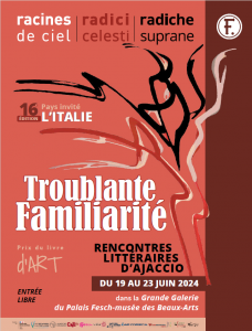 FESTIVAL LITTÉRAIRE Du mercredi 19 au dimanche 23 juin PALAIS FESCH (MUSÉE DES BEAUX-ARTS) AJACCIO La 16ème édition des Rencontres Littéraires RACINES DE CIEL présente les auteurs italiens qui rencontrent les auteurs corses autour du thème « La troublante familiarité, la rencontre avec l’Italie » organisée par l’Association Via Grenelle et Mychèle Leca, met l’Italie et […]