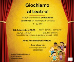 LABORATORIO PER BAMBINI DAL 20 AL 24 OTTOBRE 2025 GIOCHIAMO A TEATRO CON ANTONELLA GERRATANA Laboratorio di teatro in italiano per bambini dai 5 ai 12 anni Dal 20 al 24 ottobre 2025, dalle 9:00 alle 12:30 (È possibile rimanere fino alle 16:30) Prezzo totale : 150 € Merenda offerta! (Pranzo al sacco eventualmente fornito dalle […]
