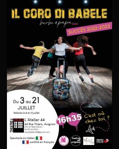FESTIVAL OFF D’AVIGNON Dal 3 al 21 luglio alle 16:35 (salvo i lunedì 8 e 15 luglio) Avignone, L’Atelier44 “Il coro di Babele” della compagnia Barbe à Papa! (in italiano con sottotitoli in francese) È il racconto a più voci di cinque migranti che narrano una stessa storia. Quella dell’esilio, più o meno volontario, di […]